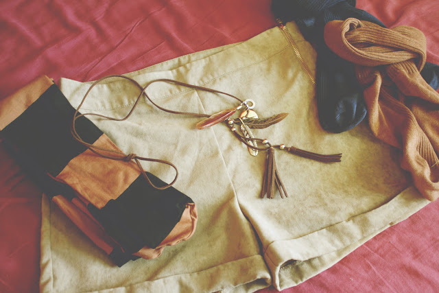 Raitasukkahousut, kaulakoru, siniset ja ruosteen väriset polvisukat H&M